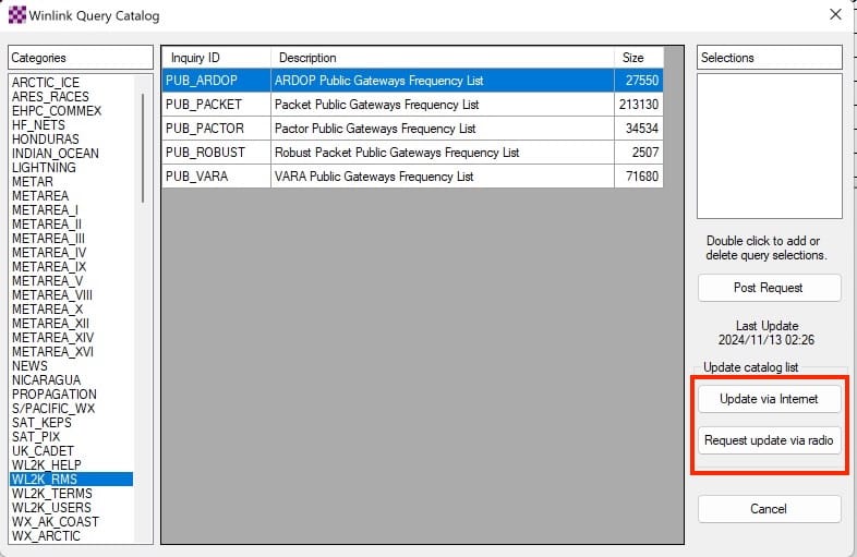 3.Then, submit a Catalog Request: Under ‘WL2K_RMS,’ choose the list of station types you want to maintain locally. Send and retrieve the messages a few minutes later.